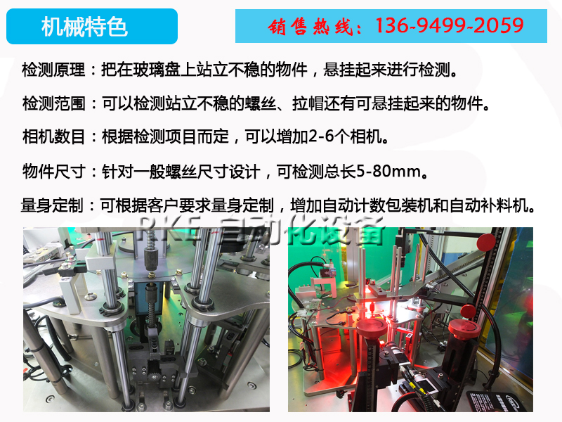 東莞瑞科自動化設備有限公司致力于自動化設備研發10余年,擁有豐富的實踐經驗,汽車長螺絲分度盤檢測,把不能站立在玻璃盤上的物件懸掛起來進行檢測,檢測的范圍廣,精度高,速度快。